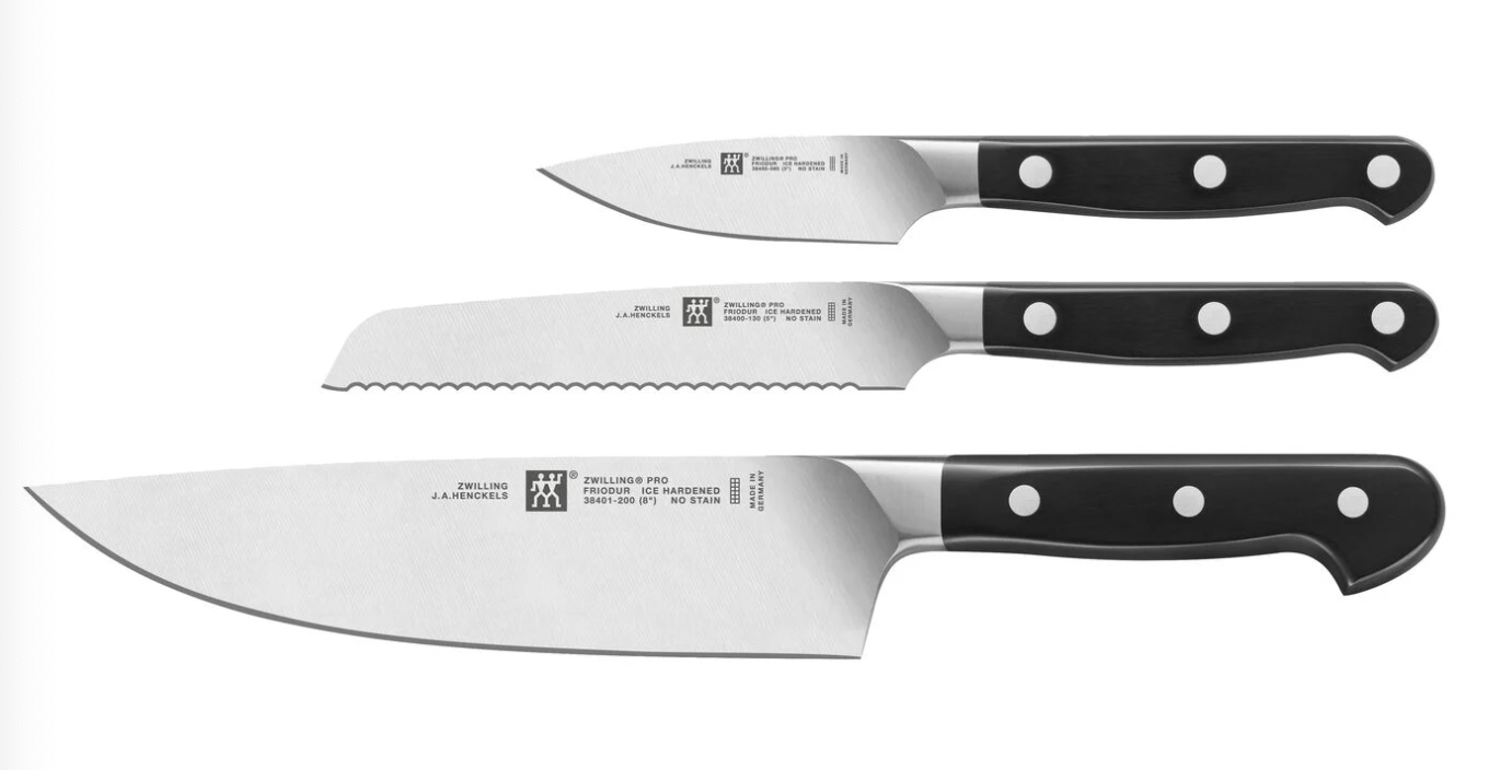This 3-piece starter set includes three essential knives for the kitchen. The all-rounder chefs knife is for slicing and dicing, the serrated utility knife cleanly cuts foods with a hard exterior and soft interior, and the paring knife tackles all your small-scale cutting jobs.