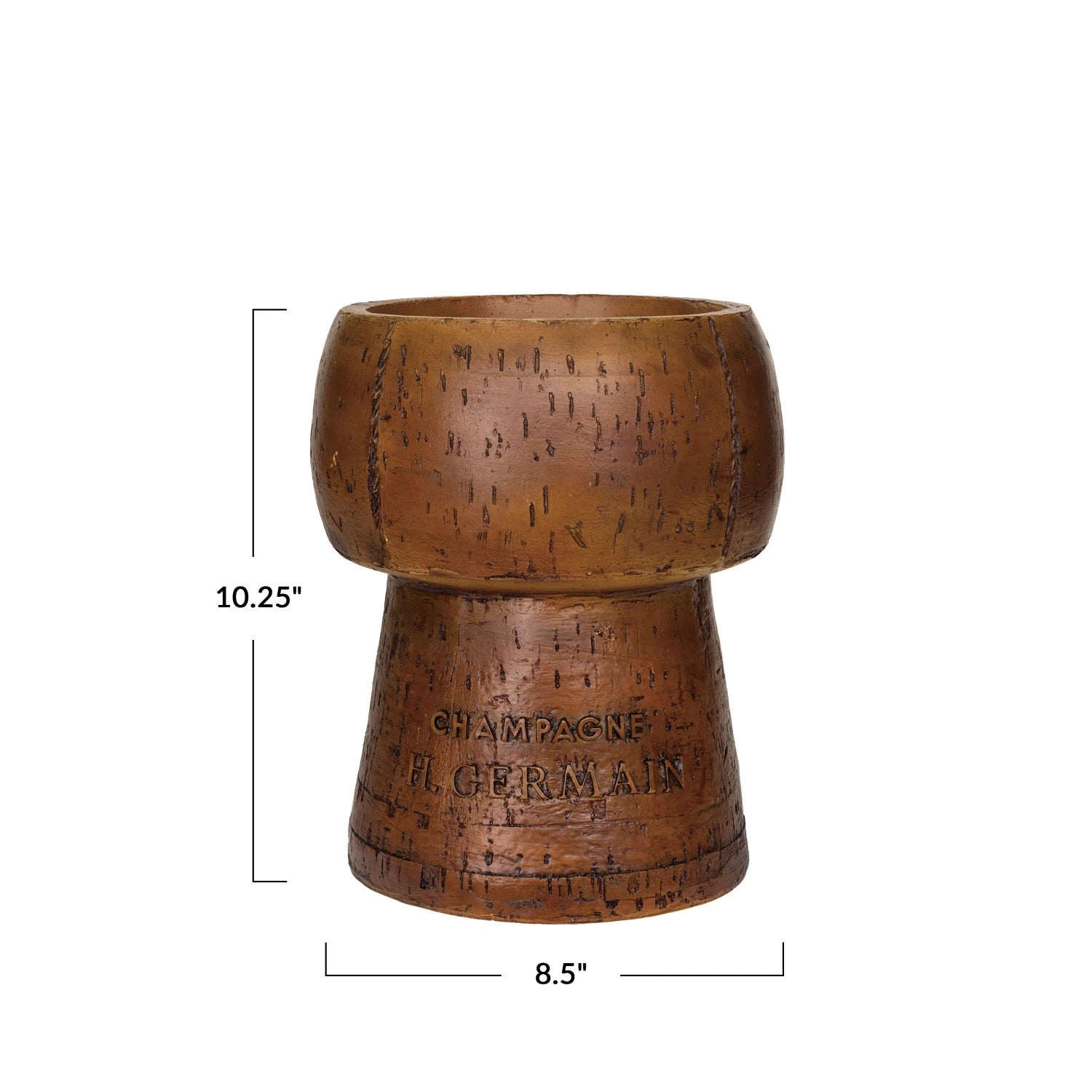 It has a round base and a lid that features a resin cork shaped design and a natural color. The resin cork shaped design creates a unique and charming effect that makes this wine cooler stand out.