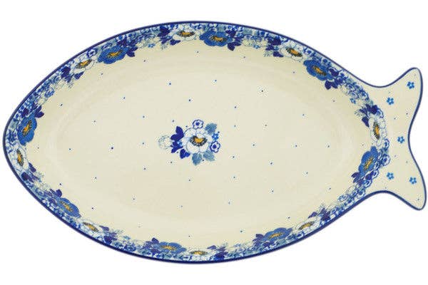 This Blue Spring 13" Fish Shaped Platter was handmade and hand decorated in Boleslawiec, Poland by skilled artisans according to old traditional methods. This Polish stoneware is microwave, dishwasher, freezer, and oven safe up to 480°F. It does not contain lead or cadmium. It is part of the Blue Spring Collection.