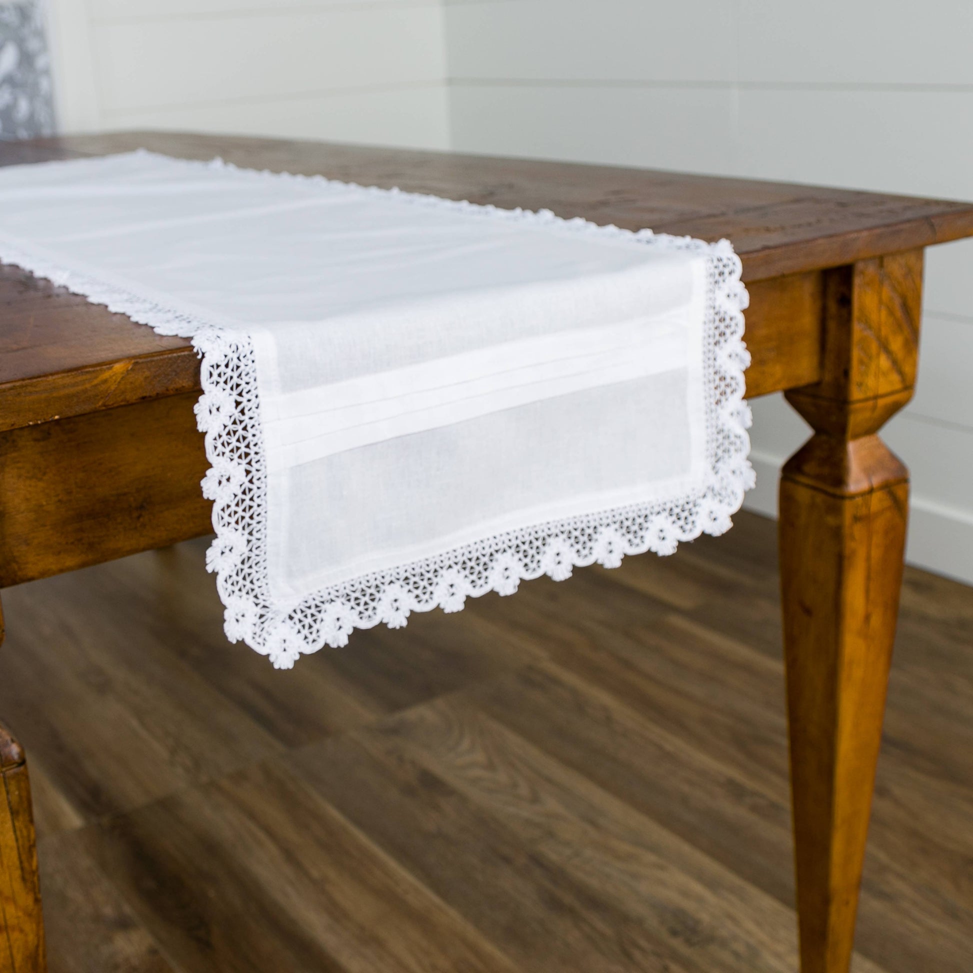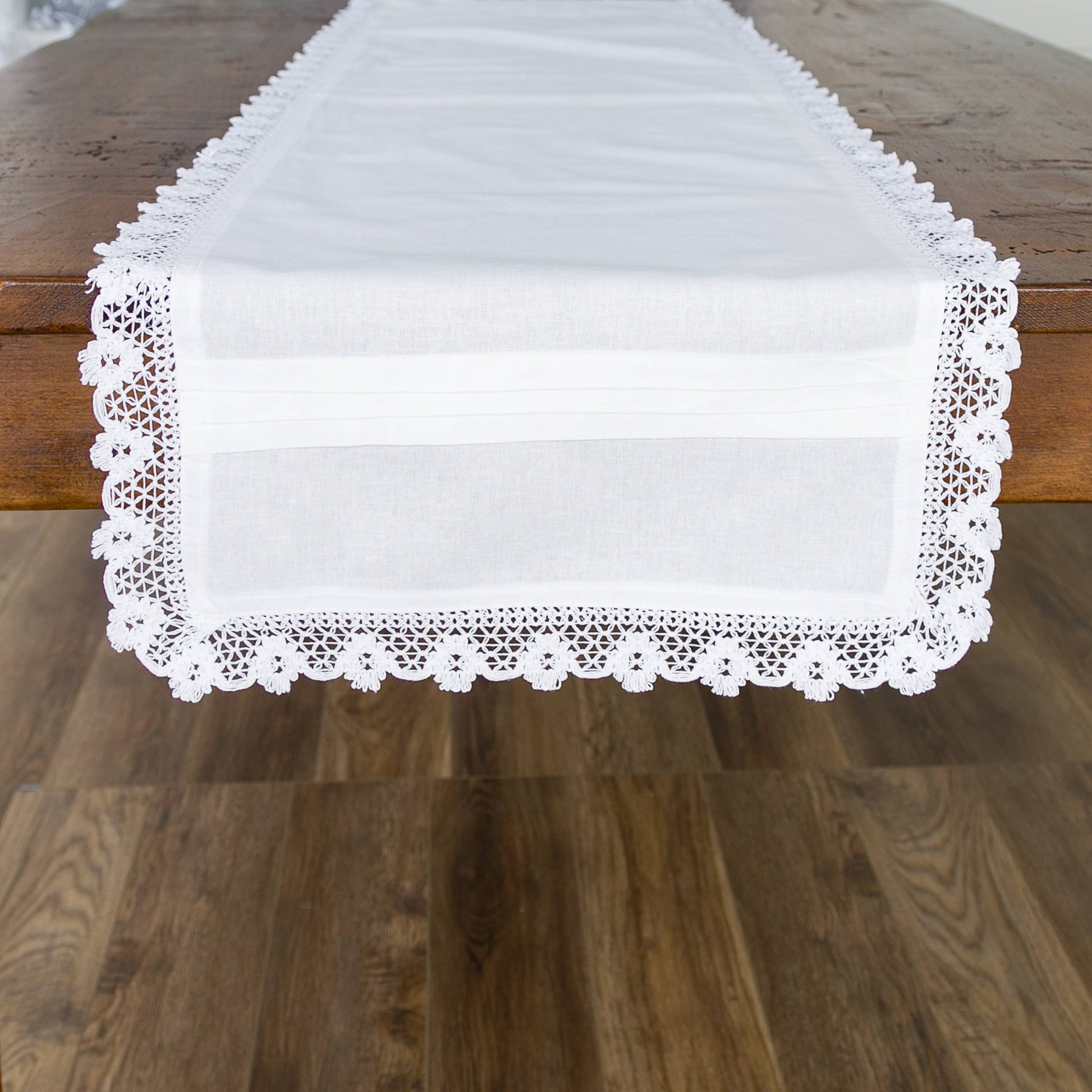 Embrace the rustic charm of your dining space with our cotton-linen blend table runner, adorned with delicate crochet detailing along its edges. Evoking a sense of bohemian whimsy or cottage coziness, this runner seamlessly blends natural textures with artisanal craftsmanship. Transform your table into a haven of relaxed elegance, where every meal becomes a celebration of style and simplicity.