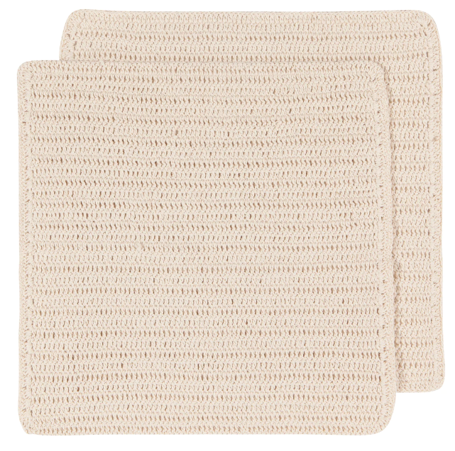 This set of two matching 12" square dishcloths is ready to tackle any kitchen job. Handmade from thick cotton yarn, these dishcloths feature a traditional crocheted construction to provide a robust cleaning experience. Ideal for everyday use, they offer a classic look to complete your kitchen decor.