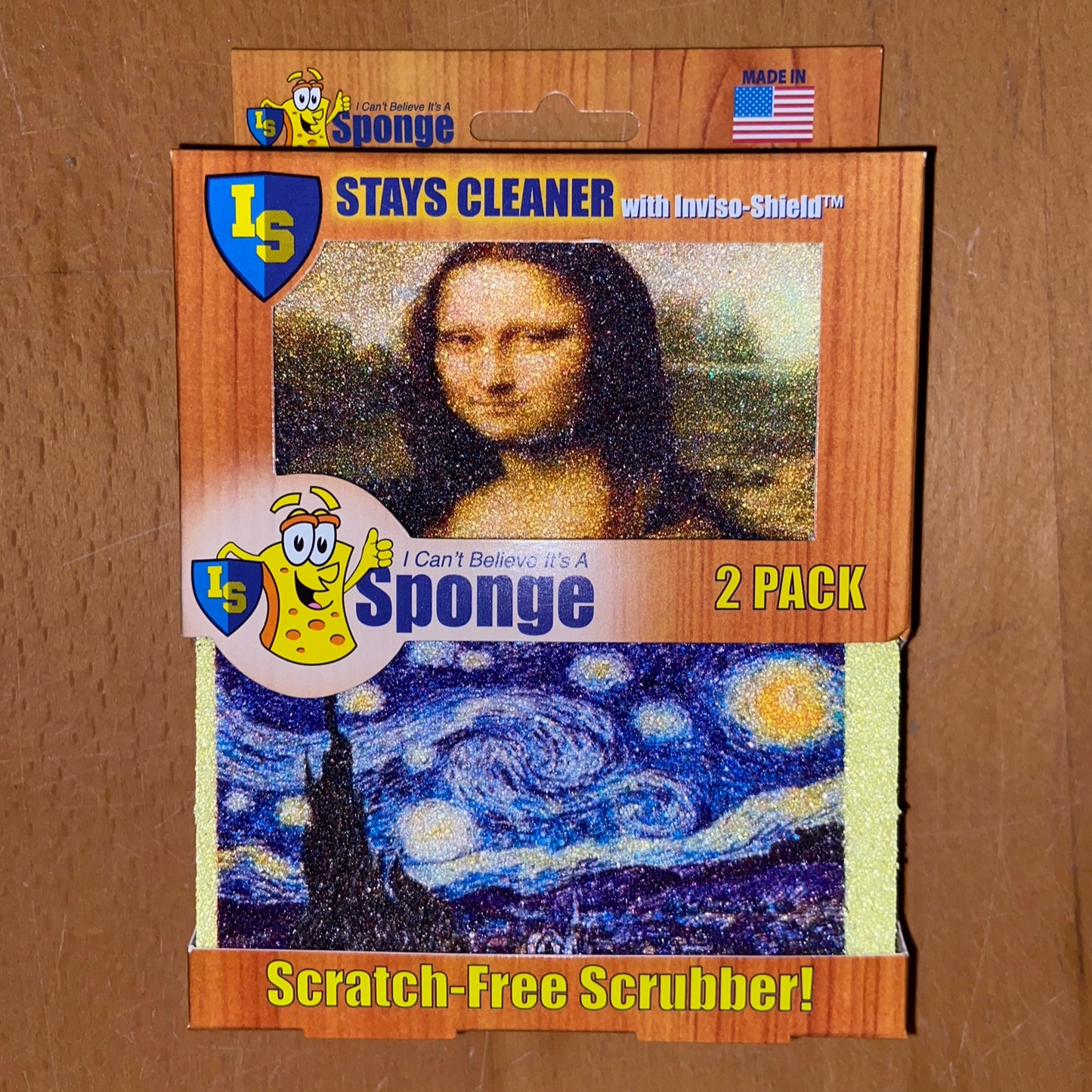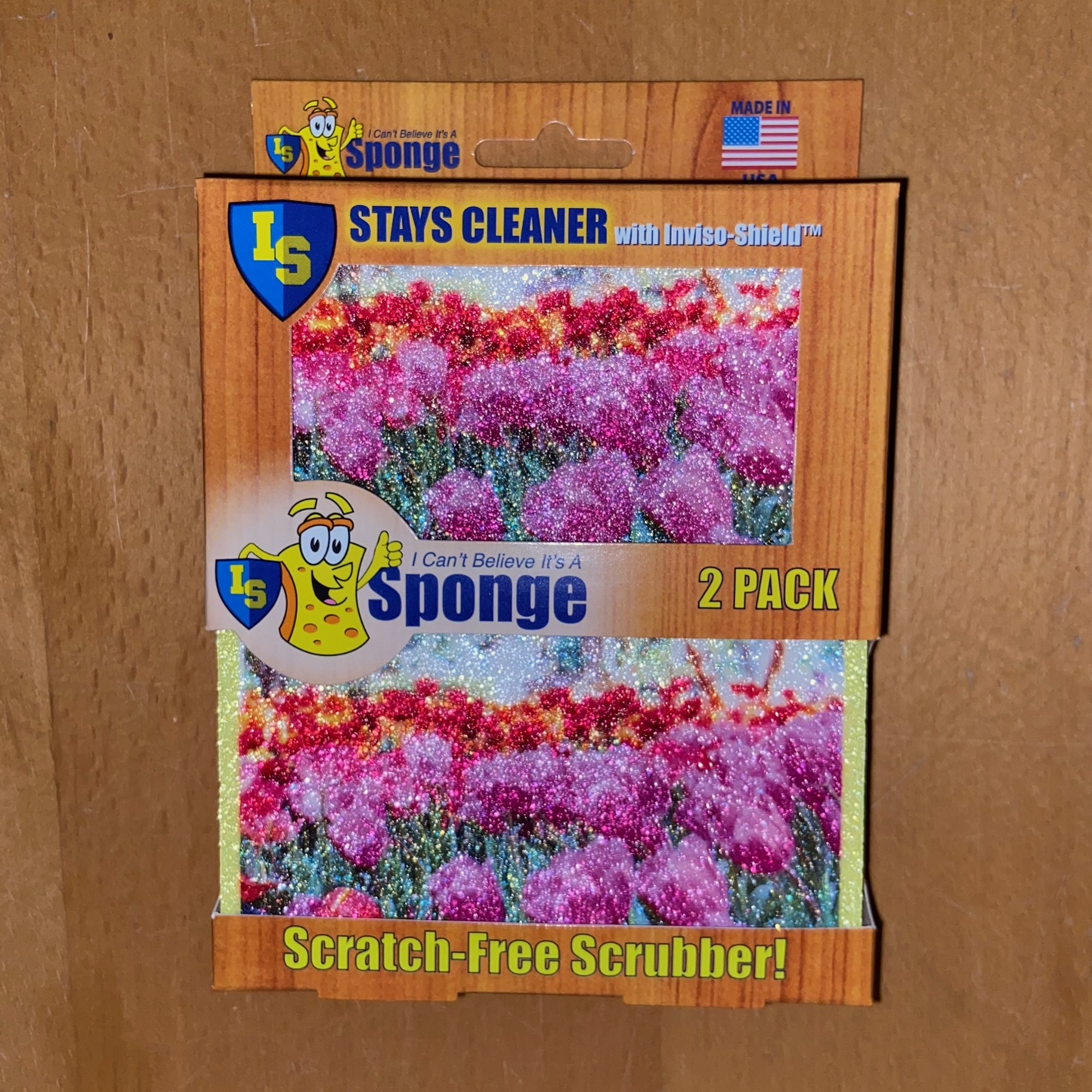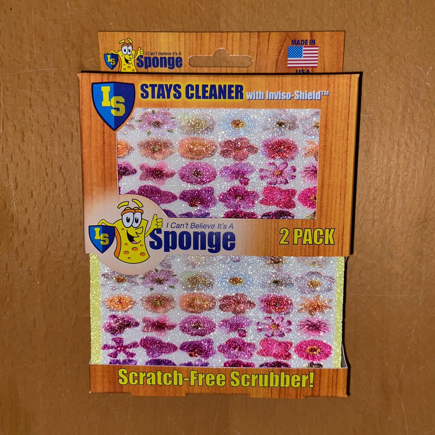 - 2 beautiful sponges 4.5 inch x 2.75 x 1 inch. Helps the environment by lasting longer! I can't believe it's a sponge. Non scratch scrubber that rinses clean fast. Durable double cell foam. Rinses clean fast! Stays cleaner. An invisible barrier keeps grease & grime off the scrubber side. Repels dirt particles quickly when rinsed under water. No need to hide that dirty sponge anymore! You deserve a beautiful design to scrub with! Dishwasher safe. Safe on many surfaces including non stick cookware, dishes, laminates, granite, stainless steel, glass, porcelain. Independently laboratory tested. I can't believe it's a sponge works great in the kitchen & bathroom. 100% made in the USA.