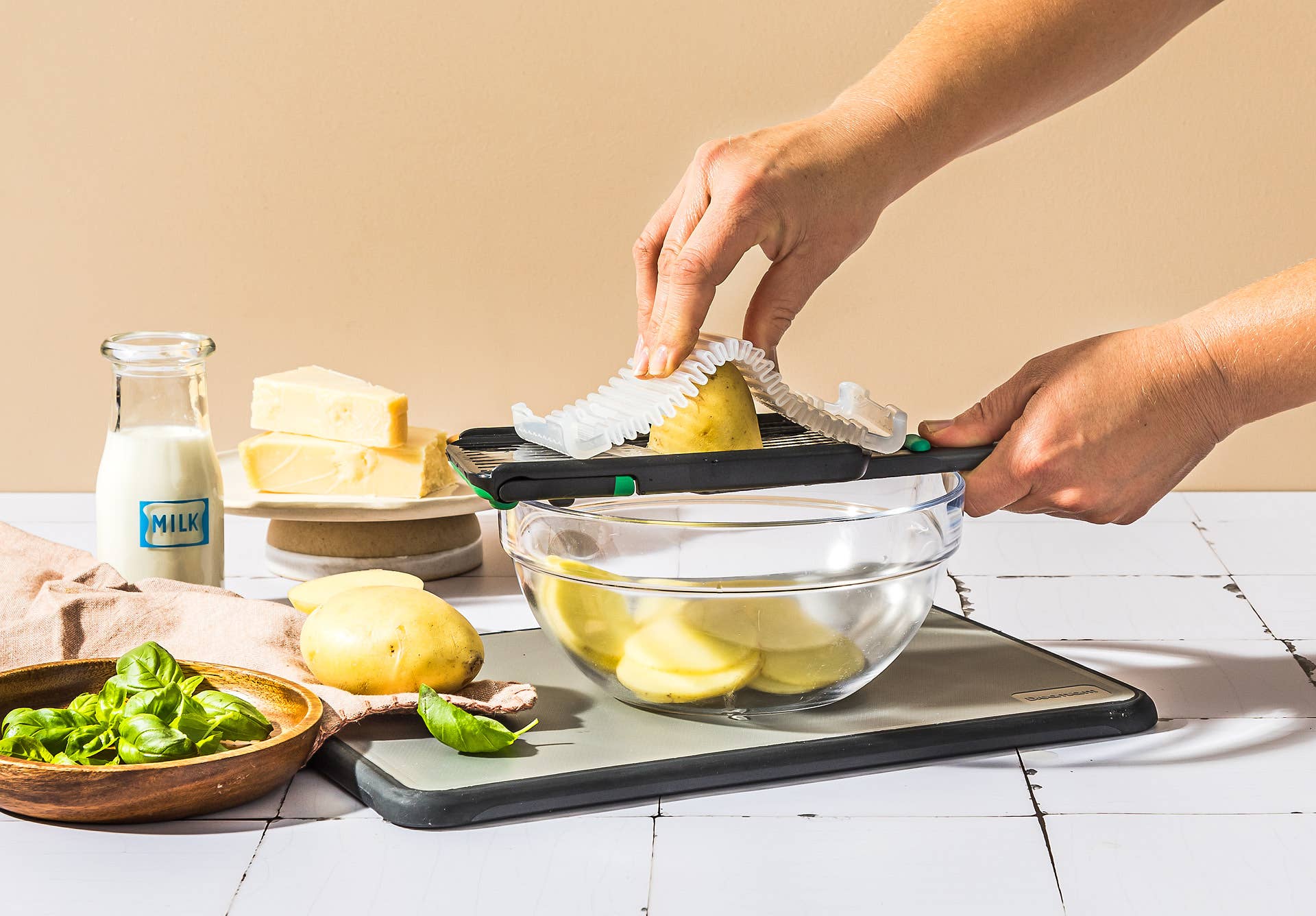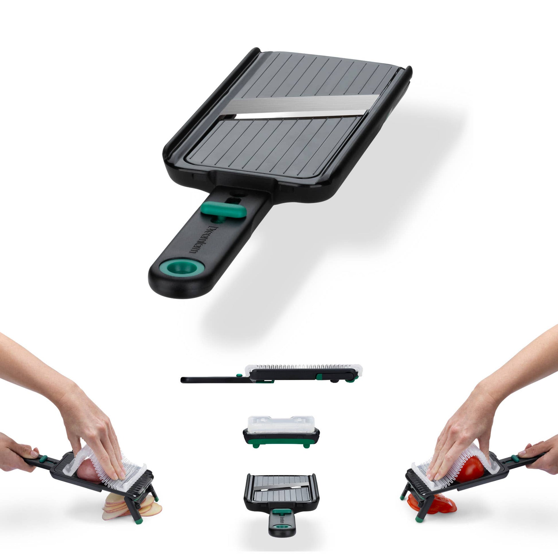 Dreamfarm Nocutu is a mandoline with a flexible finger guard that runs on tracks to safely cut right down to the last slice.
