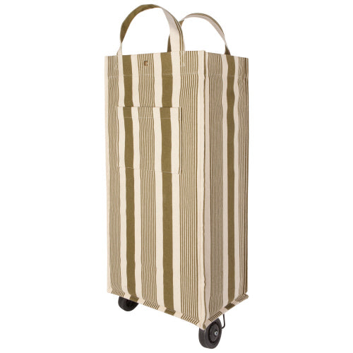 Pretty and practical, the shopping trolley puts a new spin on running errands. Sturdy canvas handles, an exterior pocket and neutral stripes make it easy and enjoyable to roll your market finds home with you.