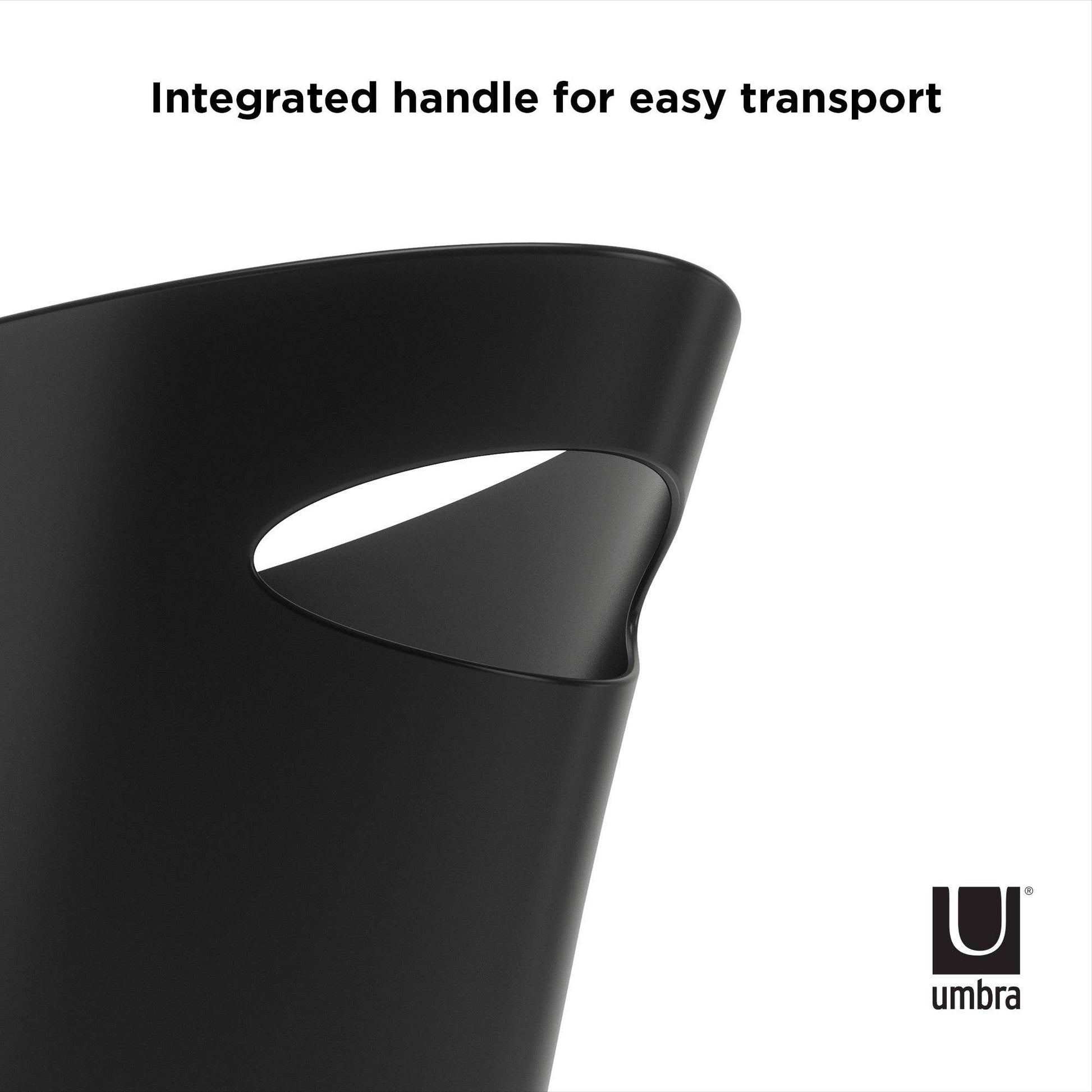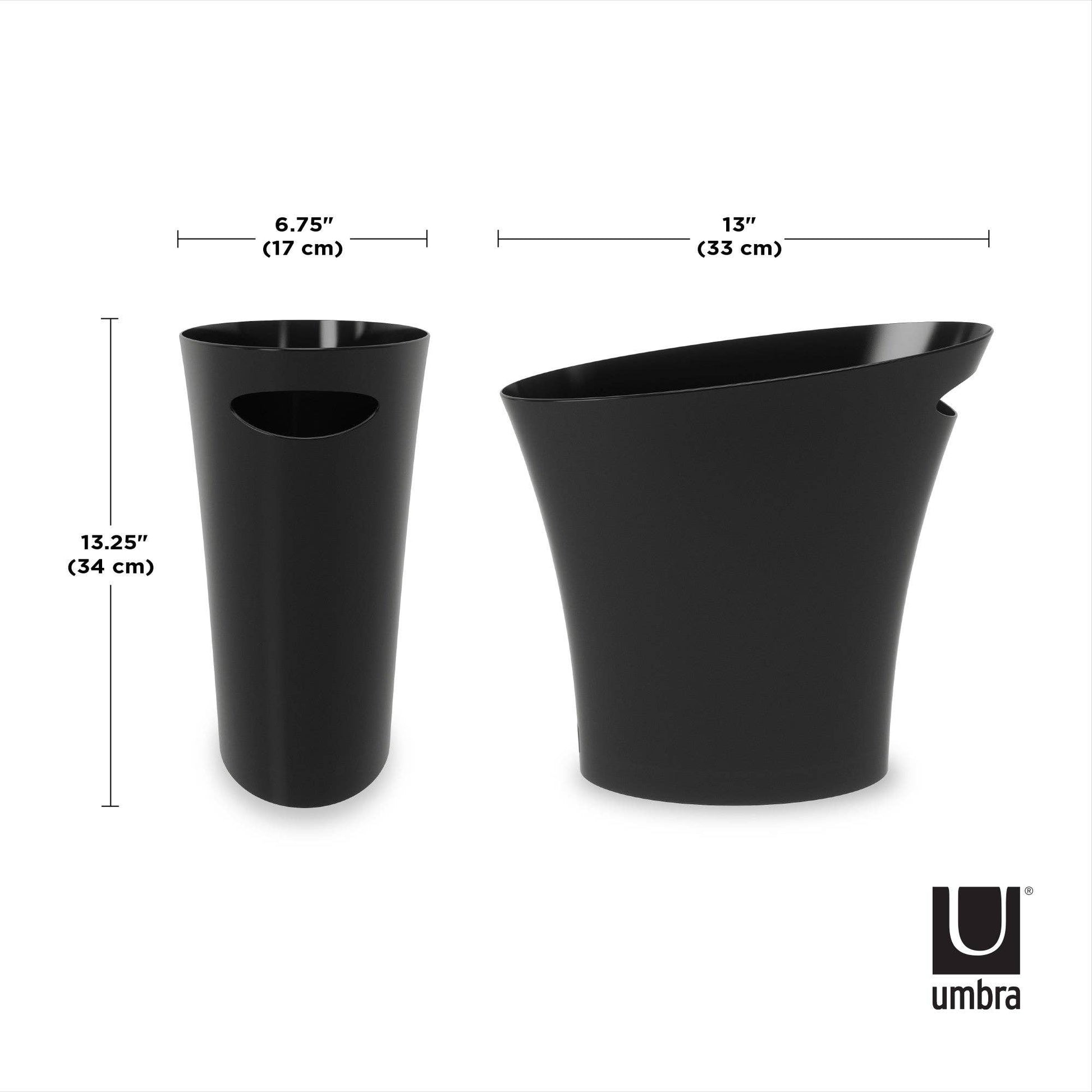 Umbra Skinny Trash Can 2-Gallon (7.5L) CapacityUmbra Skinny Can is a slim and stylish trash can, with a narrow footprint, designed to fit into small spaces and hold up to 2 gallons. Skinny is sleek and narrow, with a modern design, and comes in a wide array of finishes to match any existing decor. With a polypropylene construction, Skinny is durable and easy to maintain. Its integrated, built-in handle allows for the simple transport and disposal of contents. Skinny features rounded corners to prevent liquids from getting trapped into tight corners. Measuring at 13.25 by 6.75 by 13 inches, Skinny is able to fit into compact, unconventional places and make a contemporary, bold statement.