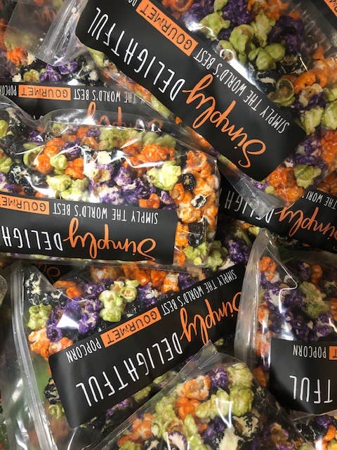 A spooktacular blend of orange, grape, green apple and black cherry popcorn. 8oz bag